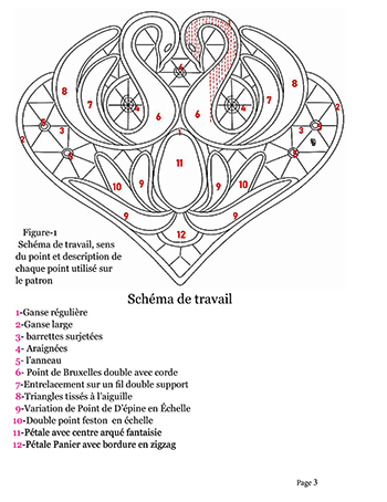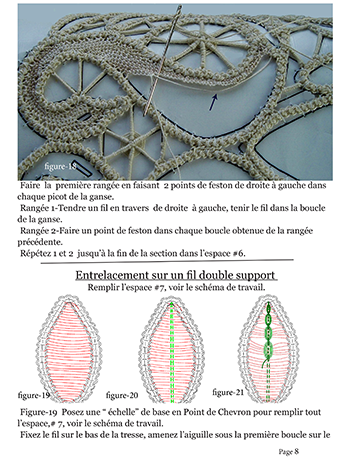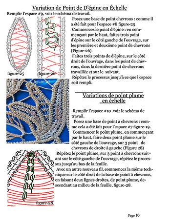 Point de Bruxelles avec cordon, entrelacement sur un fil double support, triangles tissés à l’aiguille, variations de point de plume, éventail central arqué fantaisie, panier tissé avec bordure en zigzag. étc