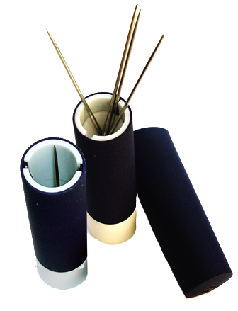 Mold like a lipstick, with a similar twisting mechanism, has a magnetised base to hold the needles so that do not fall out even when you hold it upside down.
