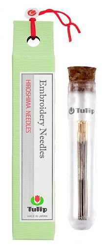 High quality hand embroidery needles from Tulip Hiroshima with a sharp tip. Needles are made in Japan and are nickel plated steel, with gold plated eyes. They are polished lengthwise to ensure smooth fabric piercing and needle eyes are polished from both sides to insure easy threading.