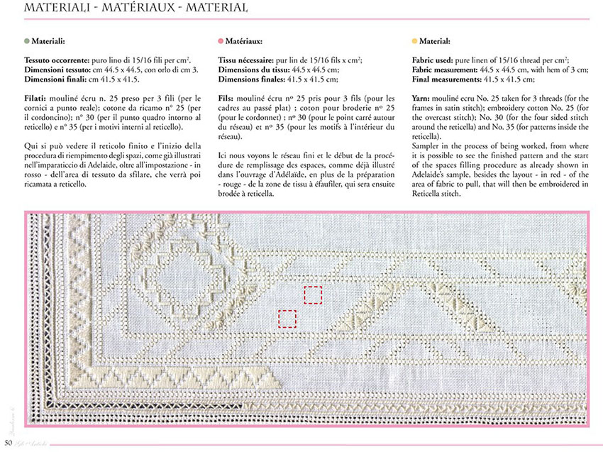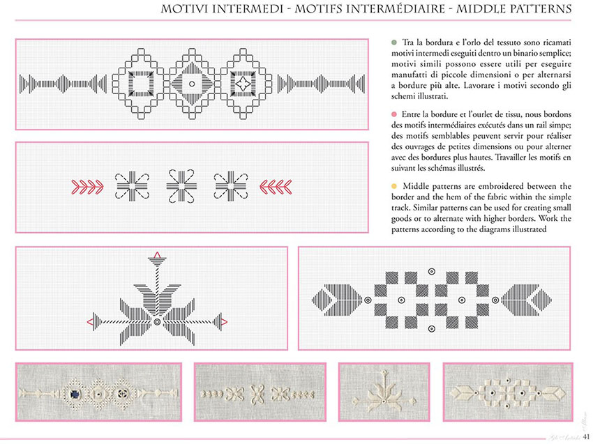 This volume also includes diagrams and instructions for making various works where the old point combines with the reticello. In addition to a guide for making the works presented using the instructions provided, this book can also serve as a source of inspiration for the personal interpretation of the motifs presented. Once they have reached this level of knowledge and skill, each embroiderer will be able to define their own method according to their personal uses.