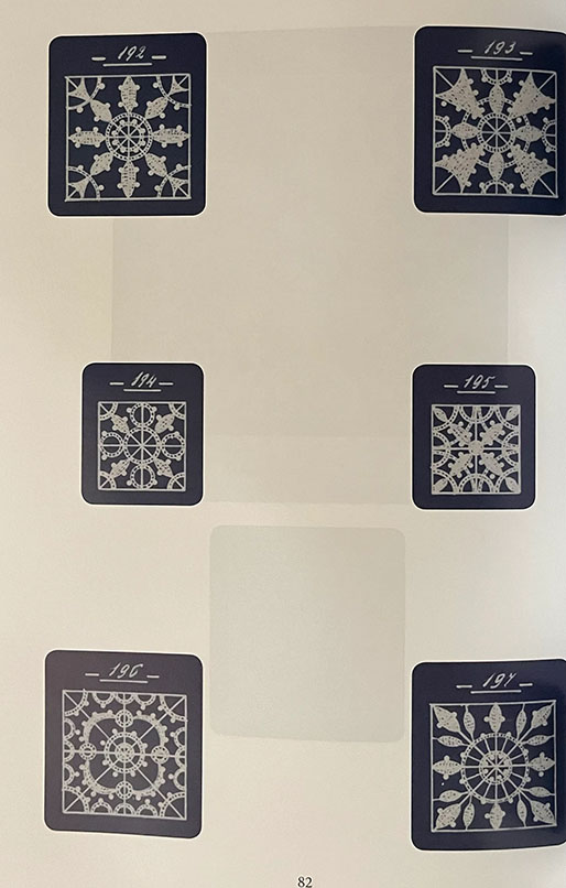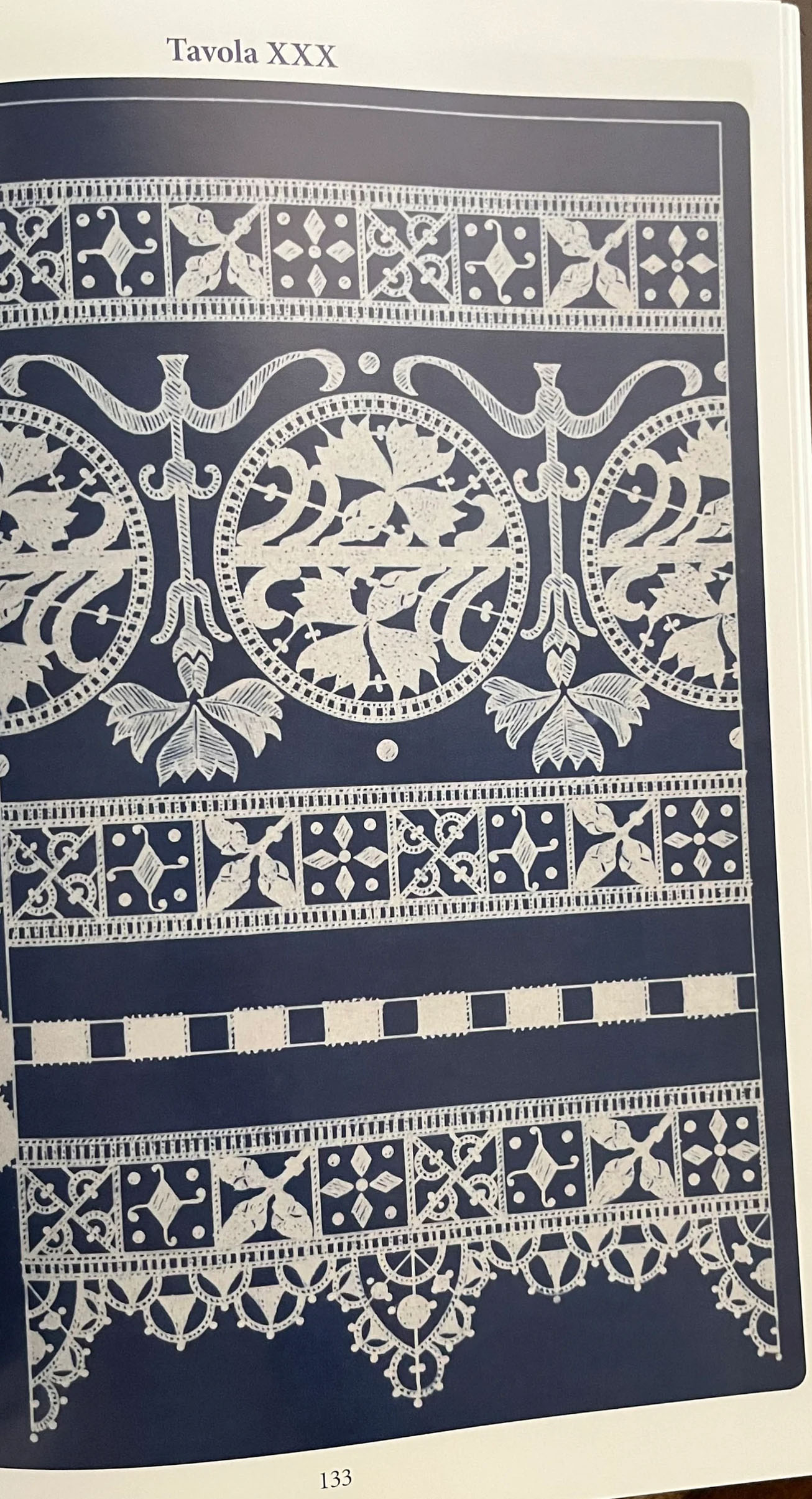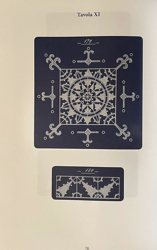 Il s'agit d'une réimpression d'une publication du début du XXe siècle redécouverte, écrite par un auteur inconnu dont les œuvres avaient été perdues au fil du temps. Avec une préface de Bianca Rosa Bellomo, cet exemplaire unique—désormais en possession du conservateur—offre 329 dessins pour Aemilia Ars, reticella et broderie, permettant ainsi de le remettre à l'attention des passionnés. L'annexe comprend une copie anastatique d'un volume de 1909 rédigé par Cleofe Mingarelli Ricci, probablement aussi l'auteur du livre original.