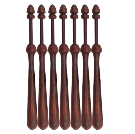 Fuseau Bayeux, fabriqué en bois de Morado. Le Morado est un bois exotique d’Amérique du Sud, remarquable par son cœur de bois brun-violet foncé, parfois veiné de nuances contrastées. Il possède un lustre naturel moyen à élevé, qui accentue sa beauté. Ce fuseau de grande qualité possède une tige longue et lisse, assurant une prise en main confortable, même avec les coussins cylindriques. Modèle très populaire, il convient à une grande variété de styles de dentelle.