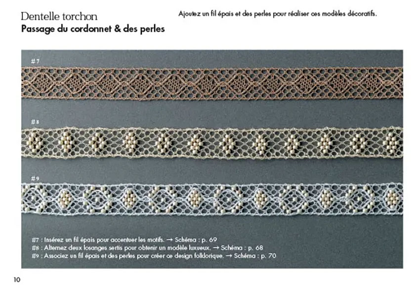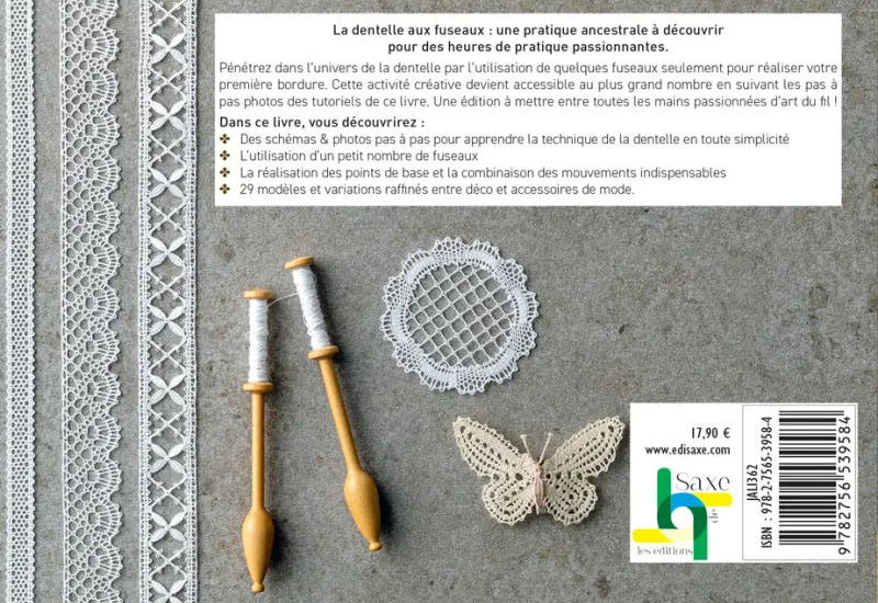 Ce livre de 96 pages est conçu pour faciliter l'apprentissage de cette technique. L'auteure a choisi de proposer des ouvrages nécessitant moins de 20 fuseaux afin que les débutants puissent s'initier en toute simplicité. En suivant les étapes illustrées par des photos, vous apprendrez les bases : le bobinage et le placement des fuseaux, la réalisation du carton et des points basiques, l'insertion de perles, l'ajout de fil, etc. La combinaison de mouvements simples des fuseaux permet de créer une grande variété de réalisations : Bijoux : bracelets, colliers, boucles d’oreilles Torchons dentelés, napperons Pique-épingles Mouchoirs… Au total, 29 modèles et variations raffinés qui feront votre fierté ! Et puis enfin on peut faire de la dentelle torchon !